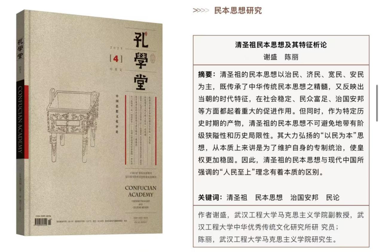本网讯(通讯员 张晓 宋嘉怡)克日,我院谢盛副教授、硕士研究生陈丽在《孔学堂》(CSSCI扩展版期刊)揭晓论文《清圣祖民本头脑及其特征析论》。