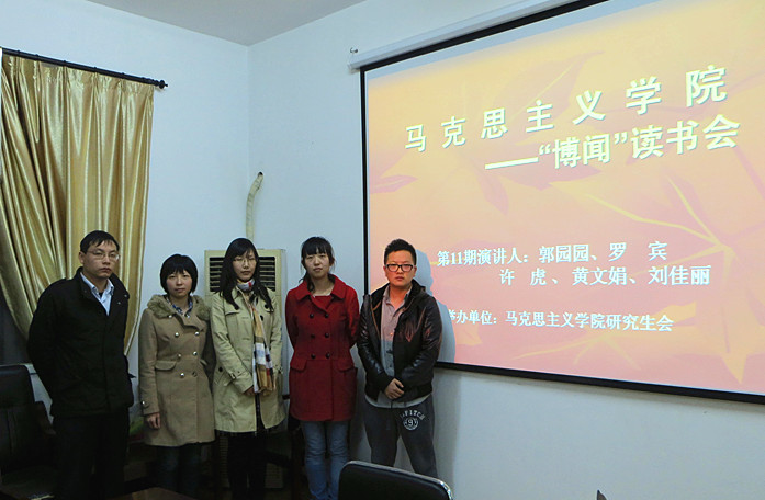 2012年3月20晚,第11期“博闻”念书会在流芳校区人生就是博聚会室顺遂举行。本期“博闻”念书会由人生就是博研究生会主席李嘉仪、学术部部长孙梓毓主持,并组织学院研究生起劲加入。此次念书会主讲人划分是来自我院的罗宾、许虎、黄文娟、刘尤物、郭园园同砚,五位同砚以“学习党的十八大精神”为主题举行了激情洋溢的演讲,赢得了在座同砚阵阵掌声。