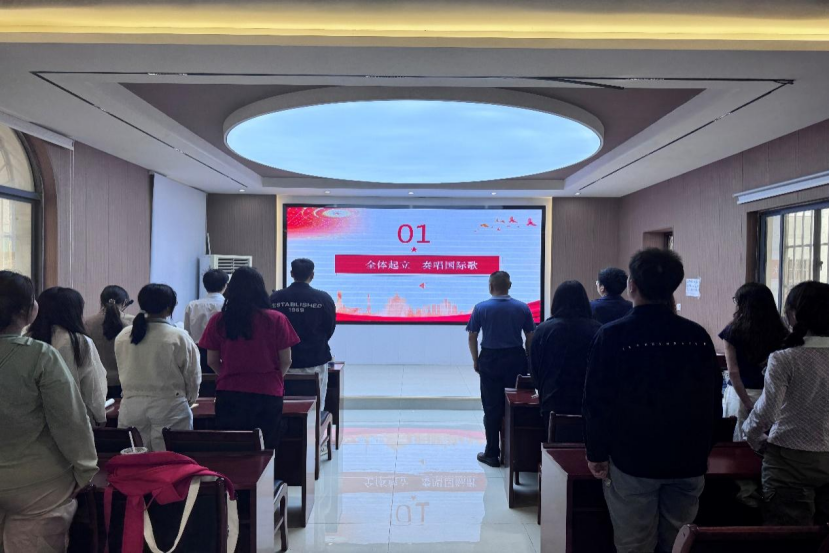 仪式第一项,全体起立,奏唱国际歌,激昂的旋律中,开班仪式正式拉开帷幕。