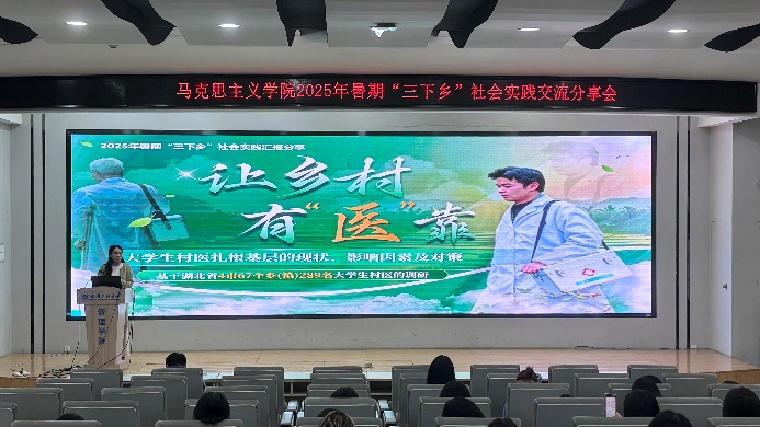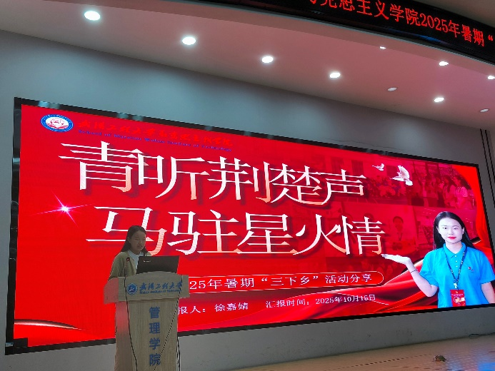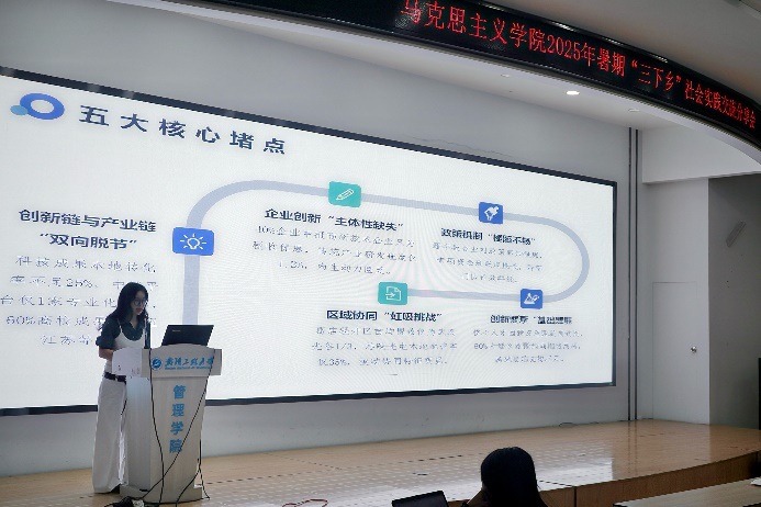 分享会第一阶段以“实践效果交流”为焦点,五支暑期“三下乡”实践团代表依次上台讲话,用鲜活案例与生动细节,展现马院学子在实践中的继续与生长。