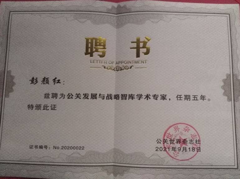 (通讯员蔡明广)克日,《公关天下》给马院副教授彭颜红博士发来聘书,约请彭颜红博士为公关生长与战略智库学术专家。