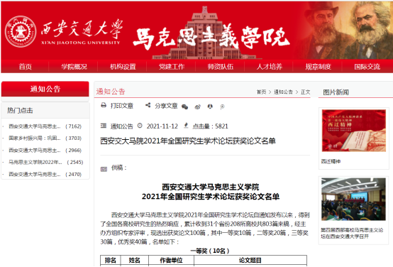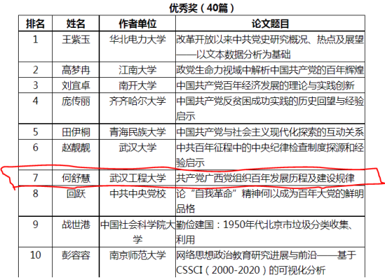 (通讯员蔡明广)克日,我院2020级硕士研究生何舒慧(导师为何景春教授)撰写的论文《共产党广西党组织百年生长历程及建设纪律》在西安交通大学人生就是博2021年天下研究生学术论坛获得优异奖。据悉,本次论坛共收到包括中共中央党校、清华大学、武汉大学、南京大学、中国人民大学、南开大学、吉林大学、兰州大学、华南师范大学、陕西师范大学、西南大学在内208所高校(81个单位具有马克思主义理论学科博士点)研究生提交的论文803篇。经主理方组织专家评审,共评选出获奖论文100篇,其中一等奖10篇,二等奖20篇,三等奖30篇,优异奖40篇。何舒慧同砚提交的论文获得优异奖,进入前100名。