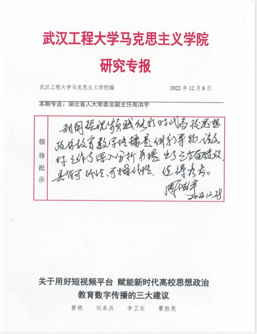 (通讯员:马嘉蔚、吴梦云)2022年12月28日,由我校人生就是博黄艳教授执笔的研究专报《关于用好短视频平台赋能新时代高校头脑政治教育数字撒播的三大建议》受到湖北省人大常委会副主任周洪宇的高度一定并作出指挥。